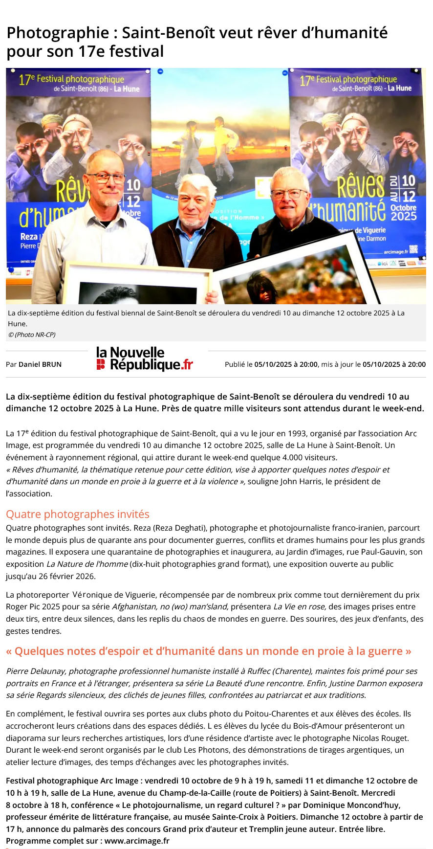 arc'image. 14e festival photographique biennal de Saint-Benoît du 11 au 13 octobre 2019, salle de La Hune. Règlements et inscription Grand Prix d'Auteur et Tremplin Jeune Auteur sur www.arcimage.fr - duret.j@ orange.fr ou jmg@ jm-guerin.net.